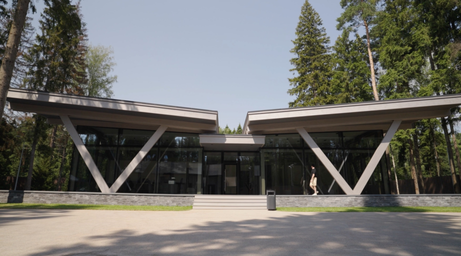 Благодаря расположению на овраге, из каждого окна открывается потрясающий вид на реку и лес, создавая атмосферу уединения и спокойствия. Внутри — просторные помещения с высокими потолками, натуральные материалы и продуманная планировка, которая гармонично вписывается в природу.