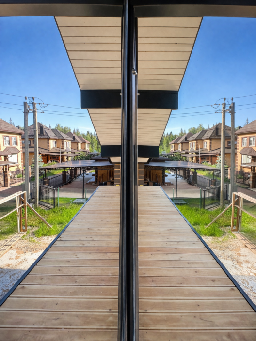 Главный эффект проекта — отражение леса в стеклянной поверхности.