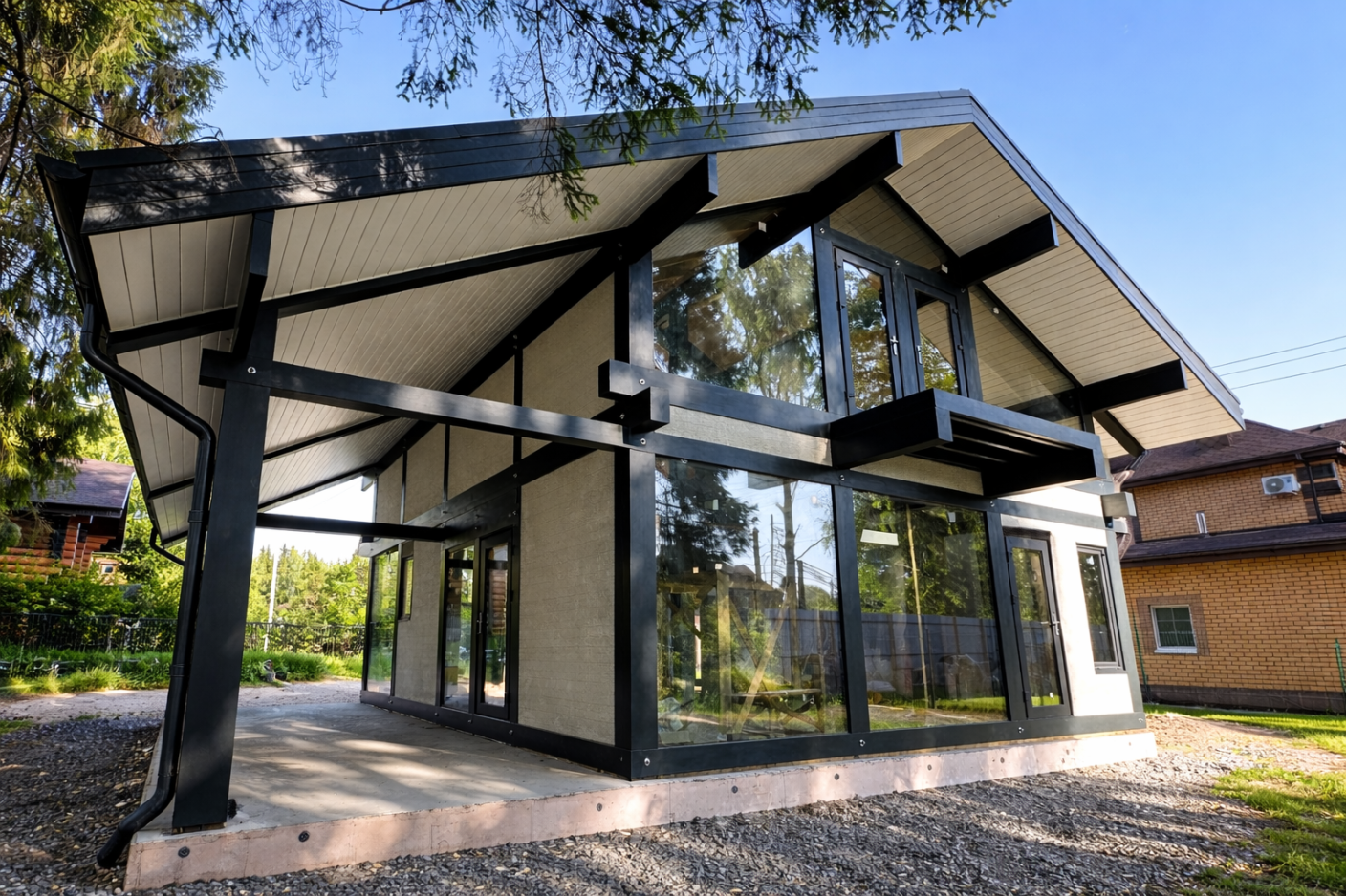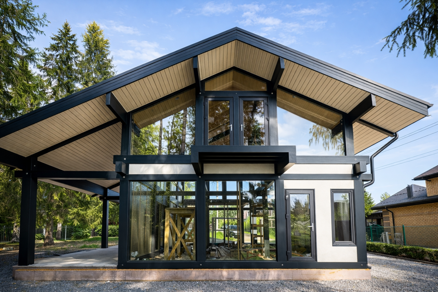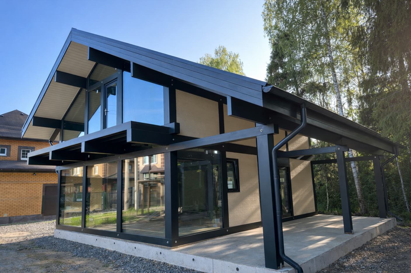 Дом перестал быть статичным объёмом. Он словно раскрывается, реагирует на окружение, вступает в диалог с ландшафтом.