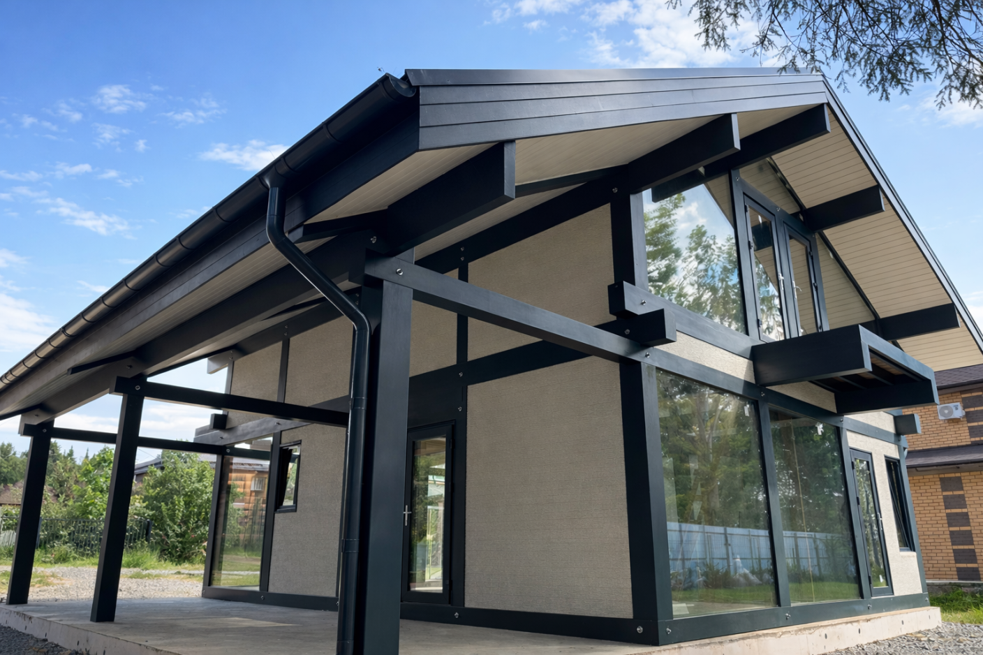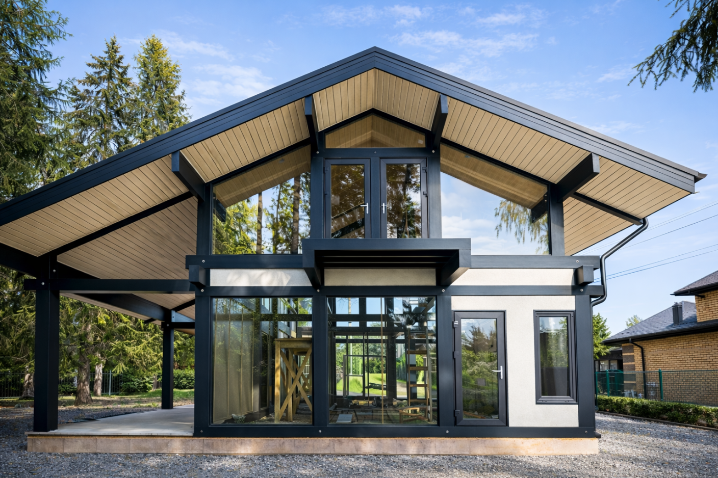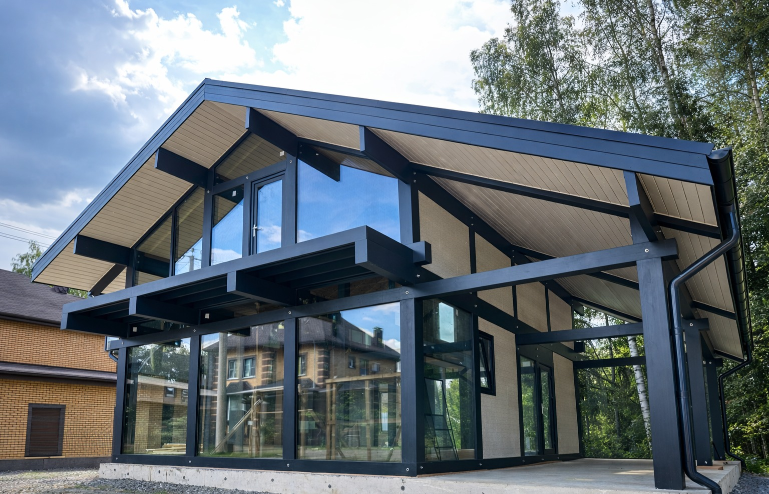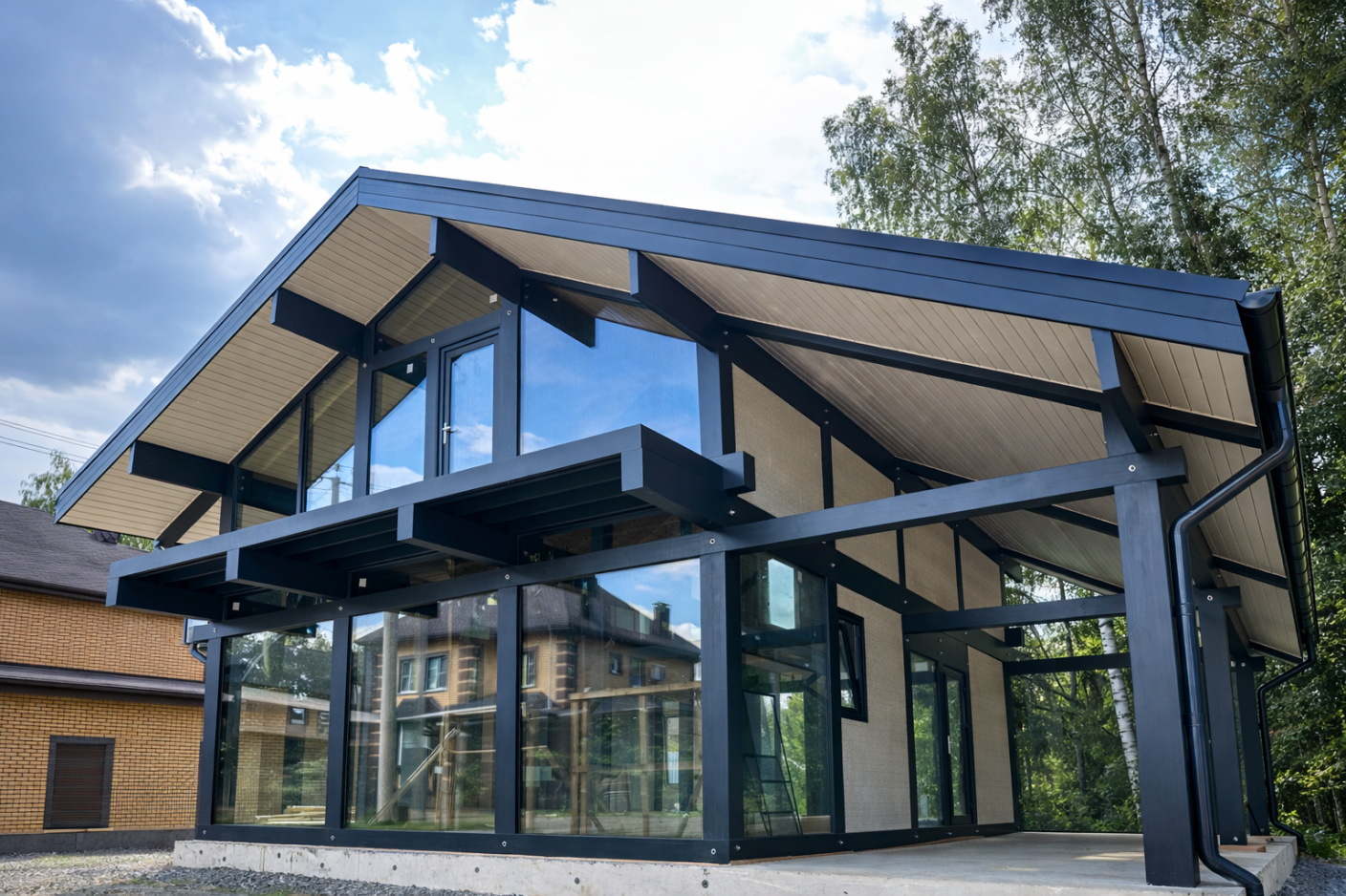 Разворот крыши создал эффект «крыльев» — динамичную линию, устремлённую в сторону участка и природы.