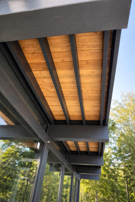 Благодаря расположению на овраге, из каждого окна открывается потрясающий вид на реку и лес, создавая атмосферу уединения и спокойствия. Внутри — просторные помещения с высокими потолками, натуральные материалы и продуманная планировка, которая гармонично вписывается в природу.