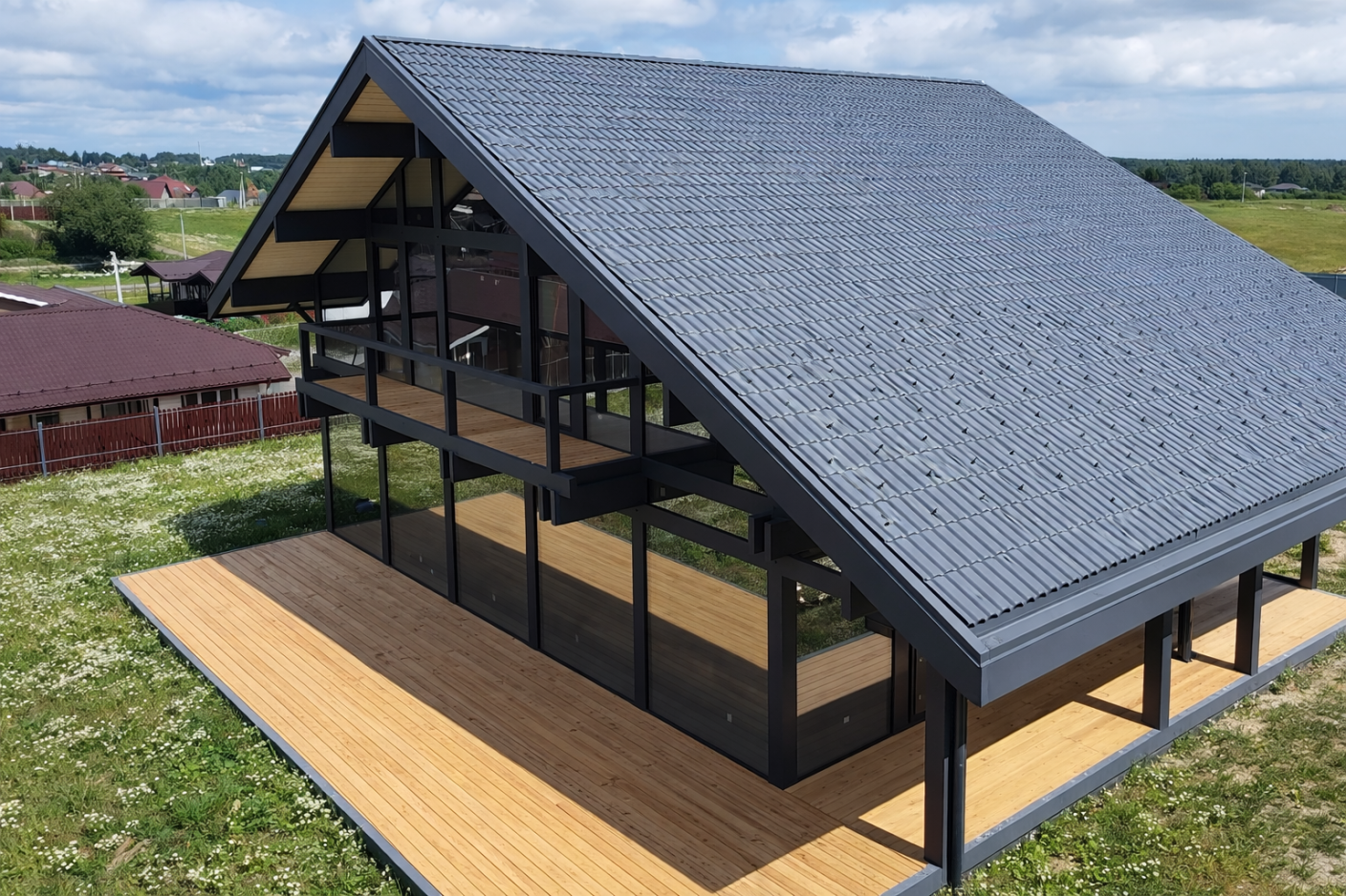 Разворот крыши создал эффект «крыльев» — динамичную линию, устремлённую в сторону участка и природы.