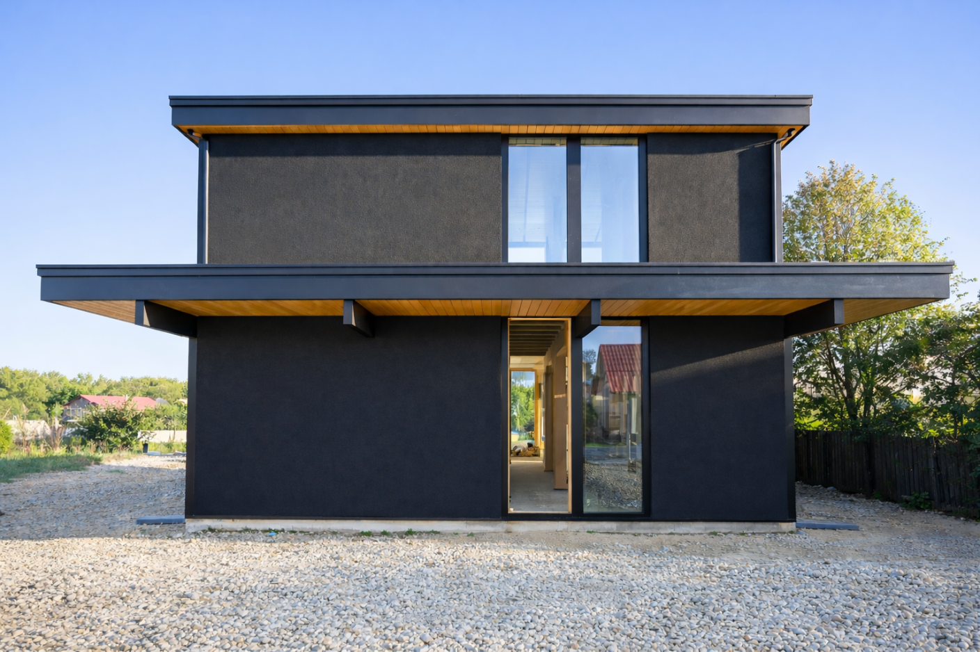 Мы взяли классический дом с разрывной крышей и развернули её в противоположную сторону. Казалось бы — простой жест. Но именно он полностью изменил характер дома.