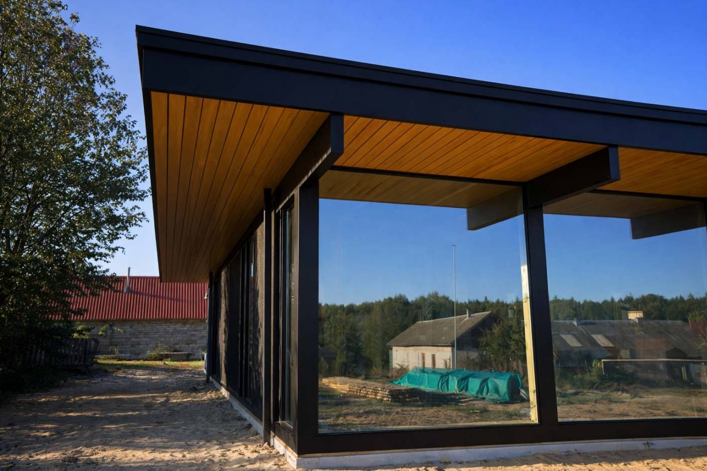 Разворот крыши создал эффект «крыльев» — динамичную линию, устремлённую в сторону участка и природы.