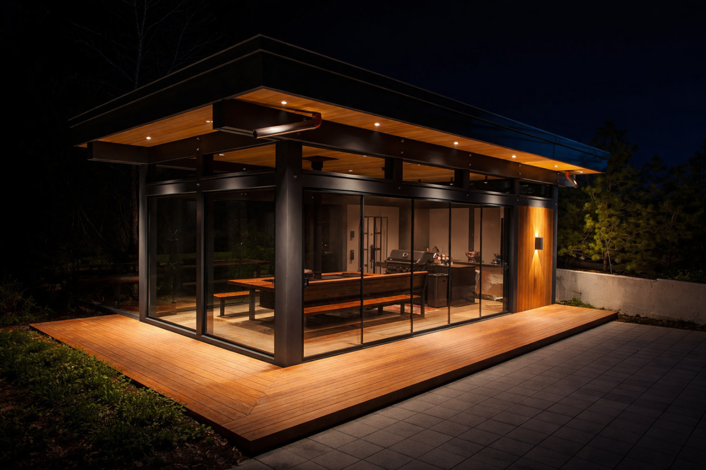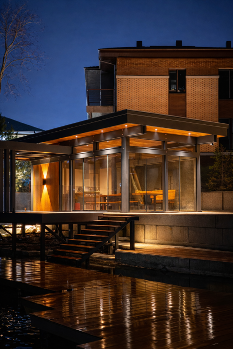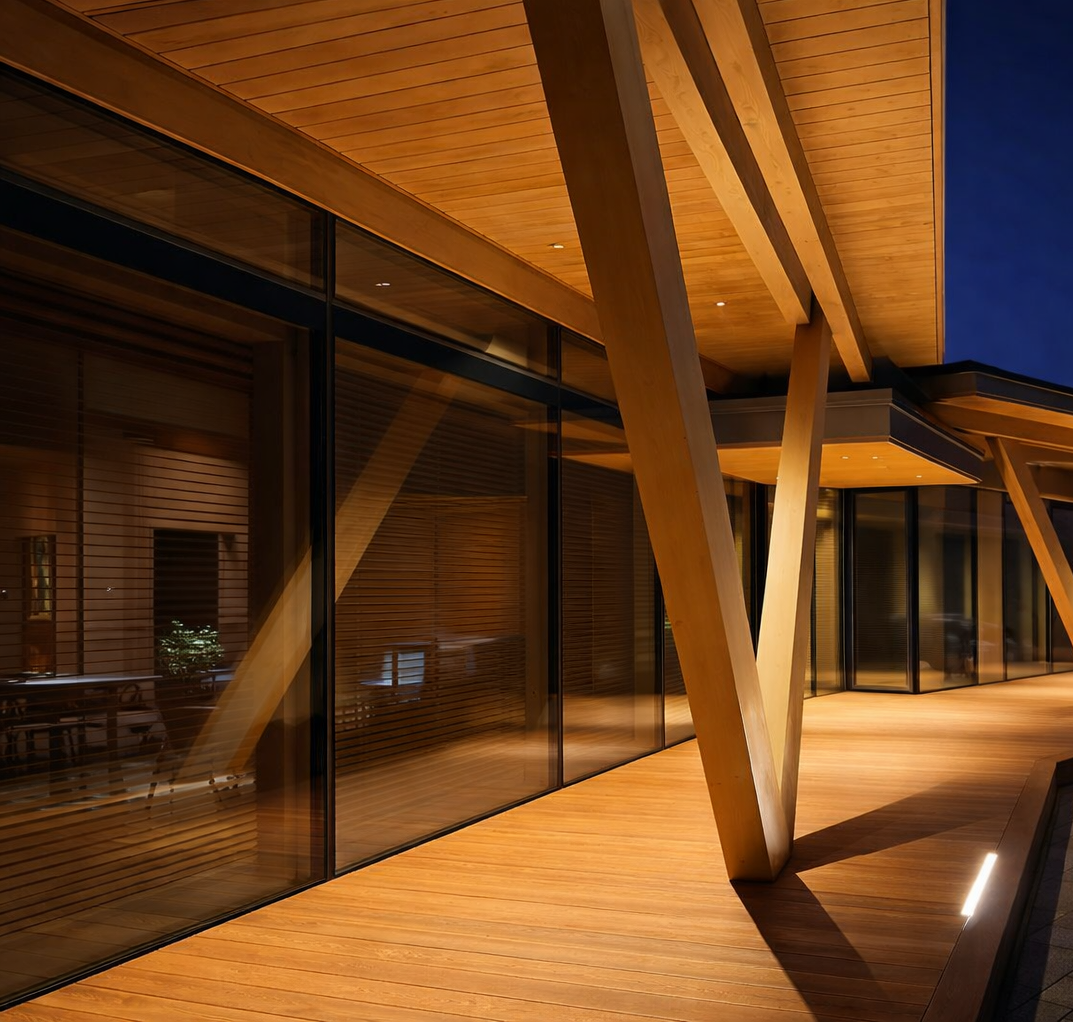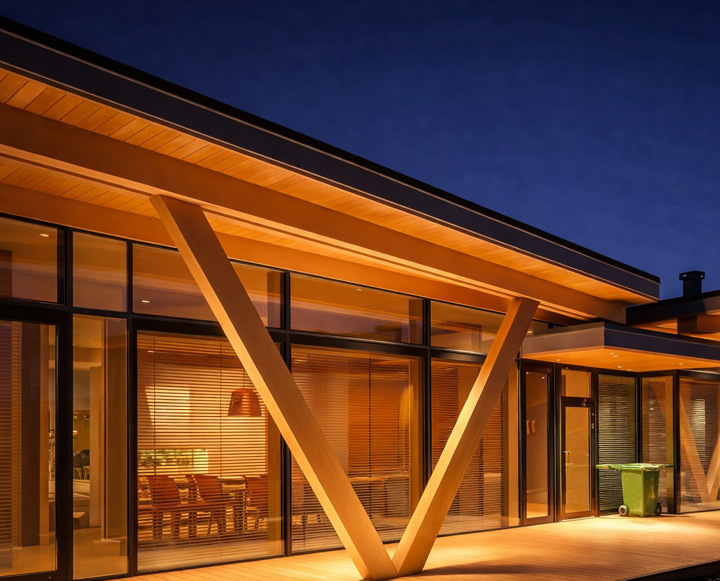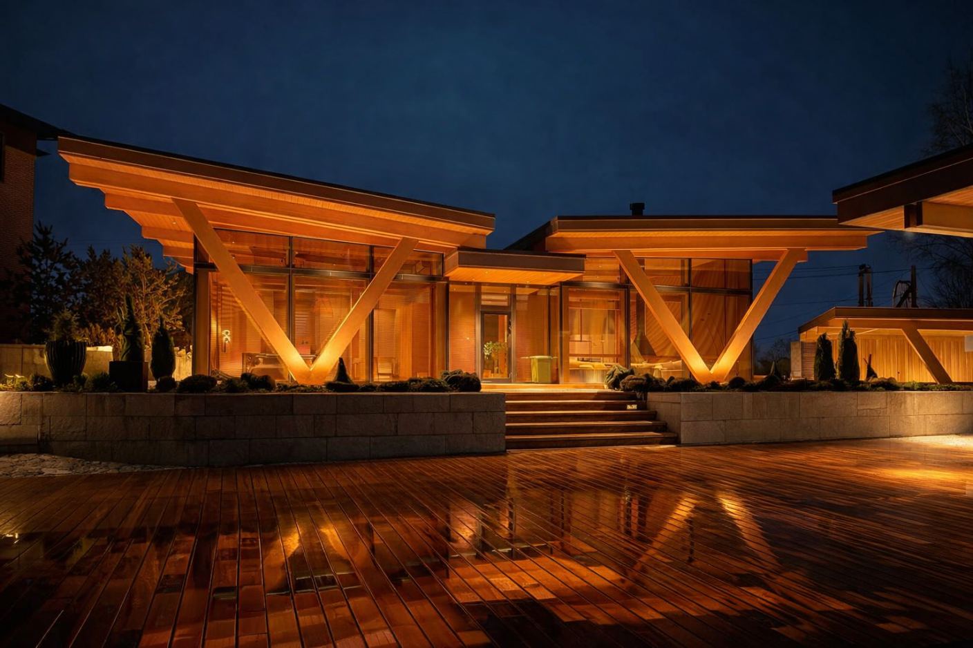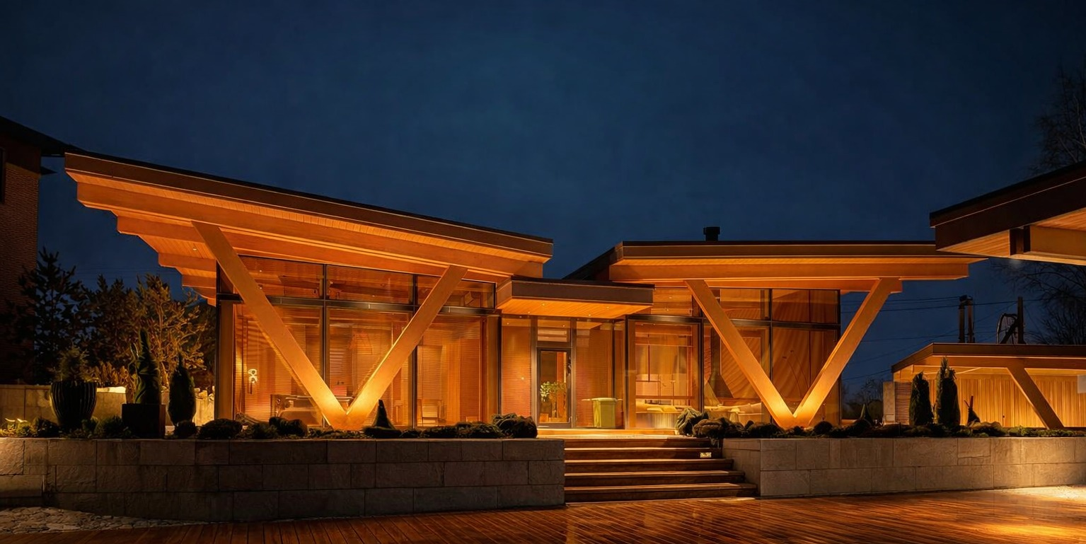 Дом перестал быть статичным объёмом. Он словно раскрывается, реагирует на окружение, вступает в диалог с ландшафтом.