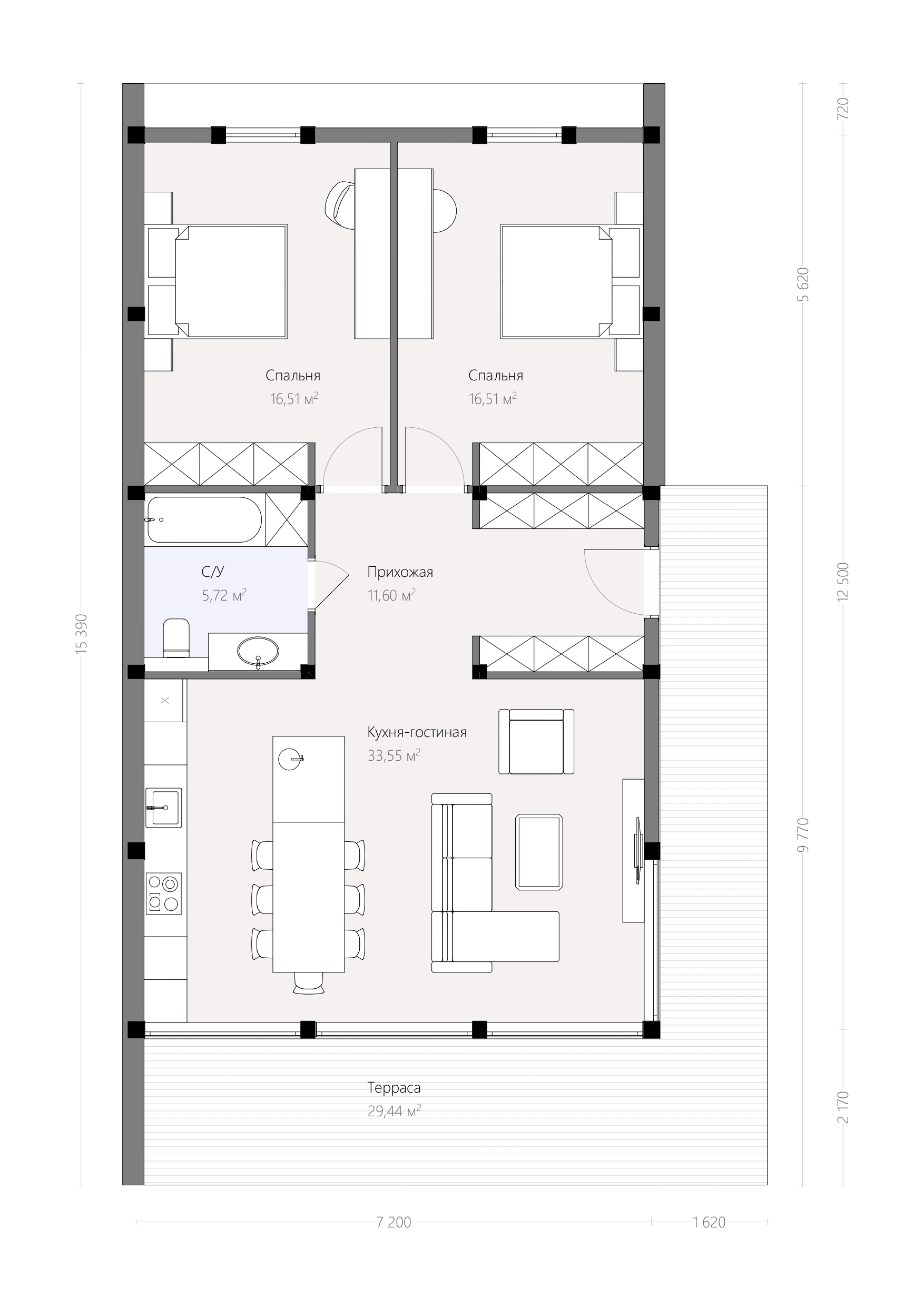 Планировка этого дома с двумя спальнями и просторной кухней-гостиной создает открытое и уютное пространство, обеспечивая функциональность и комфорт для жизни и общения.