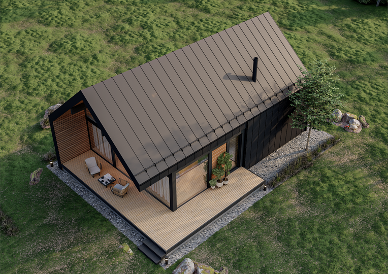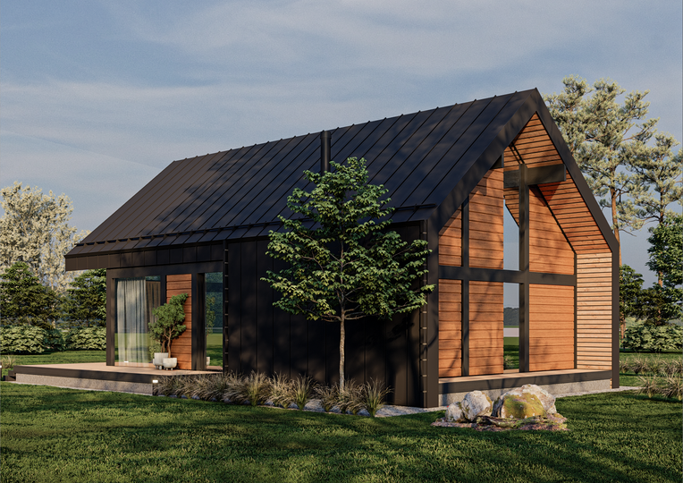 Этот проект дома с двумя спальнями и просторной кухней-гостиной идеально сочетает в себе функциональность и уют, обеспечивая комфортное проживание для семьи. Современный дизайн и хорошая организация пространства делают его пригодным для повседневной жизни и встреч с гостями.
