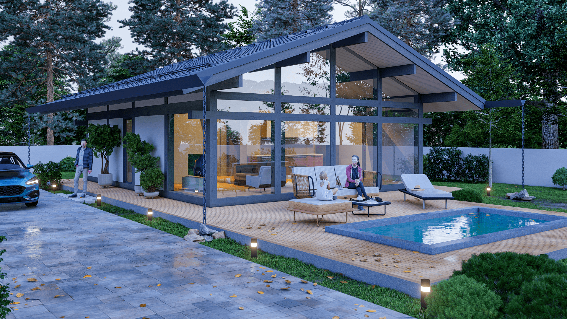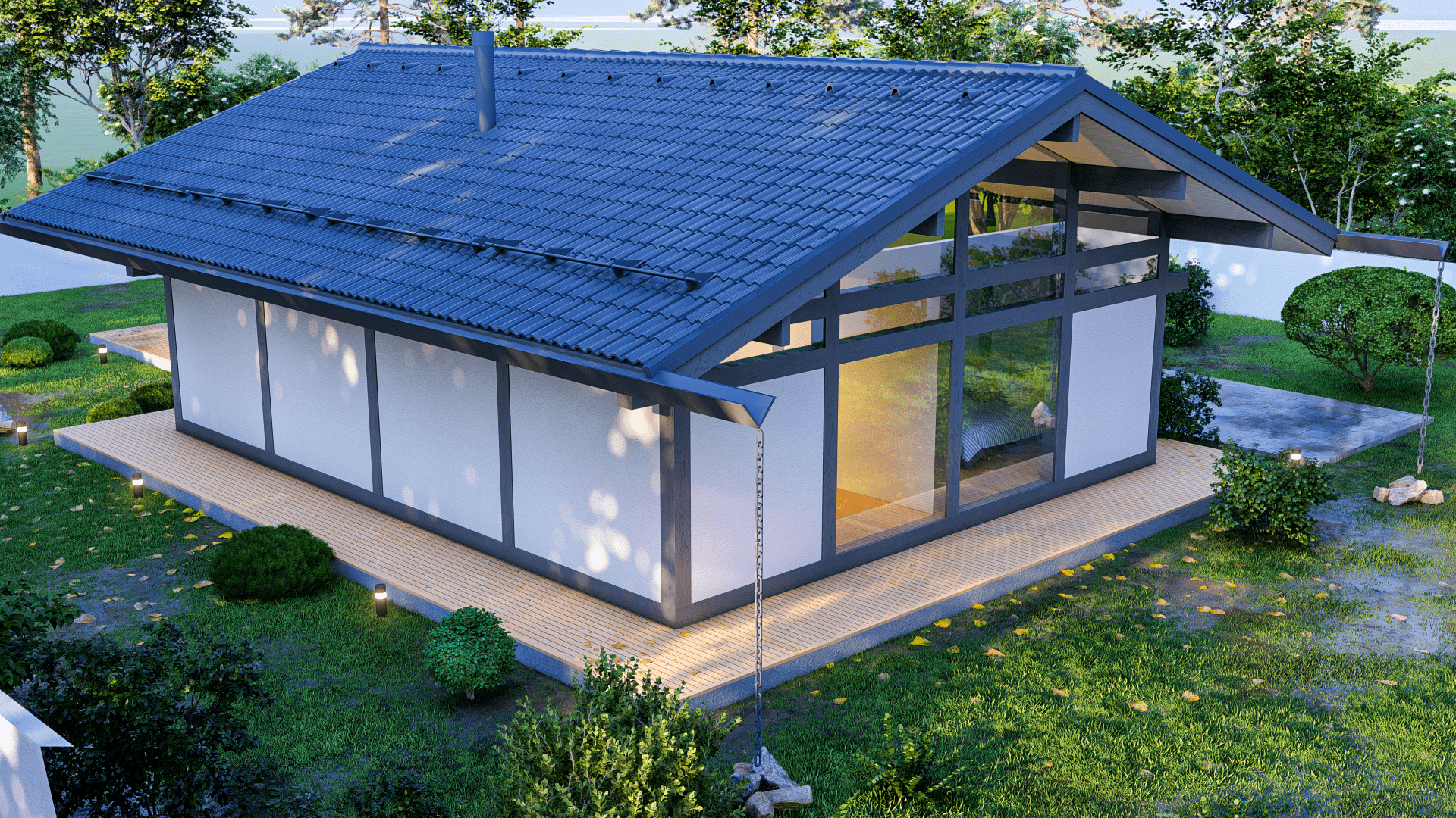 Этот одноэтажный дом с двумя спальнями и просторной кухней-гостинной представляет собой уютное и функциональное жилье для небольшой семьи. Открытая планировка создает пространство для семейных собраний и вечерних посиделок, обеспечивая комфорт и удобство повседневной жизни.