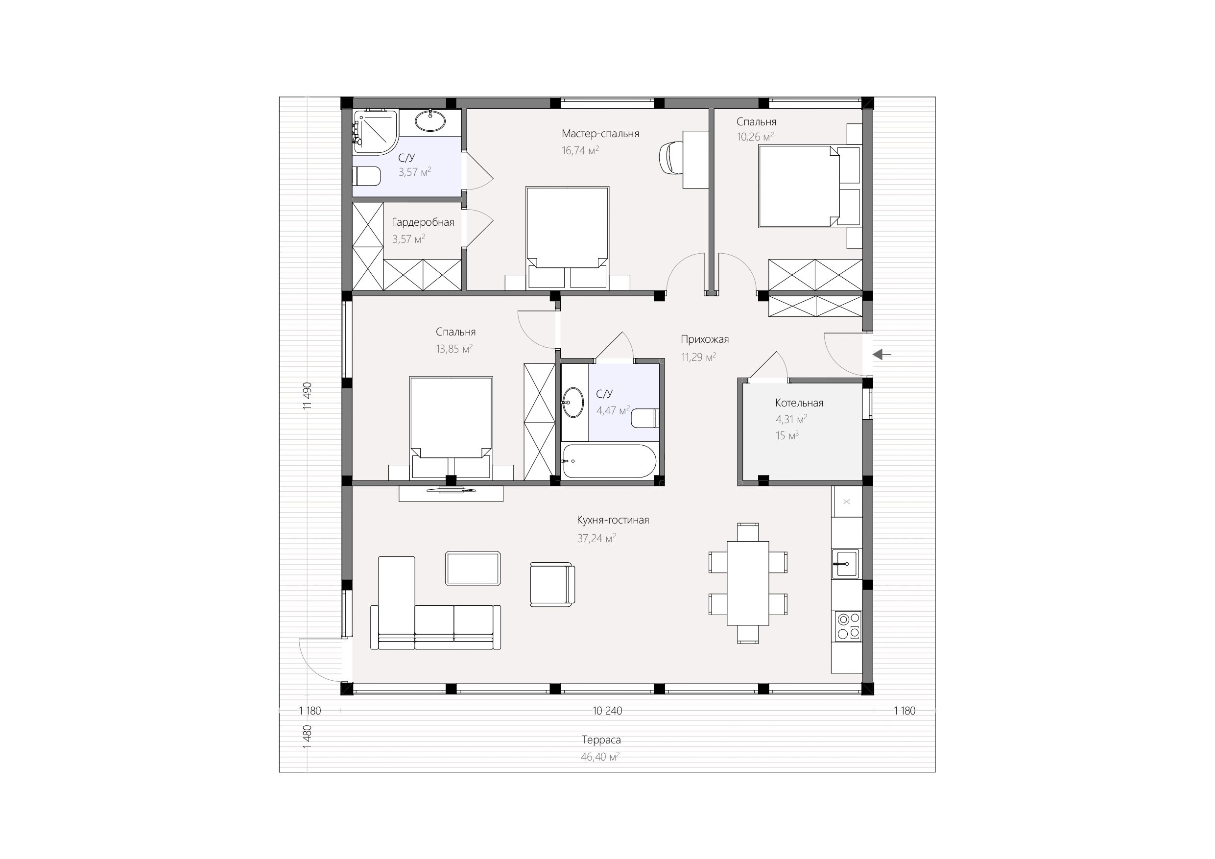 Этот одноэтажный дом с тремя спальнями и просторной кухней-гостинной представляет собой уютное и функциональное жилье для небольшой семьи. Открытая планировка создает пространство для семейных собраний и вечерних посиделок, обеспечивая комфорт и удобство повседневной жизни.