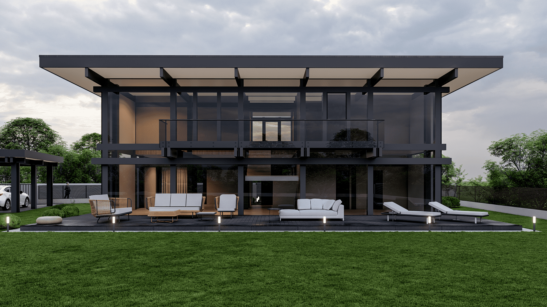 Мы сохранили основу — опорно-балочную систему и читаемую структуру дома — но переосмыслили форму. Плоская крыша придаёт объёму лаконичность и подчёркивает горизонталь, делая архитектуру более строгой и современной.