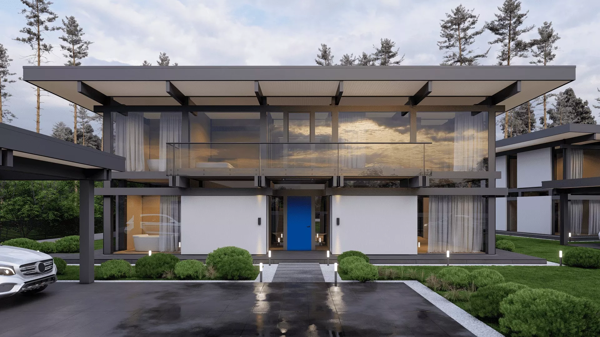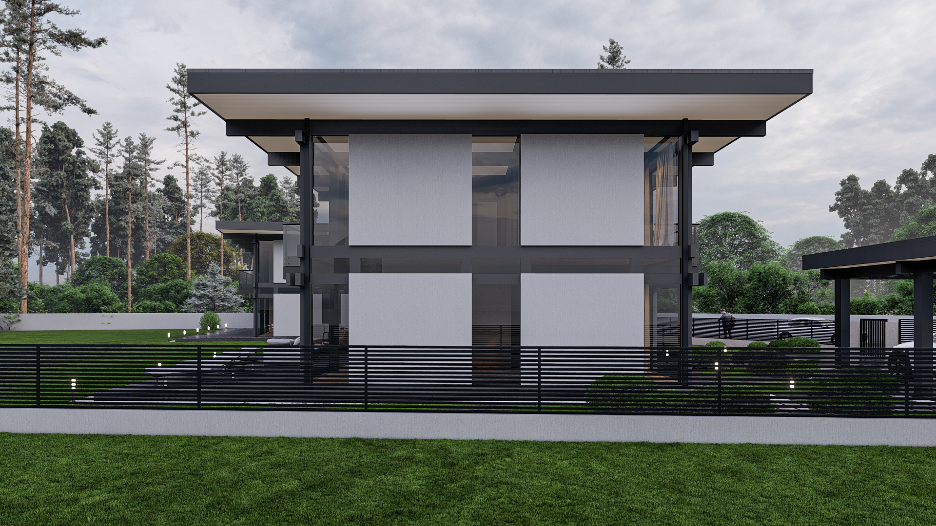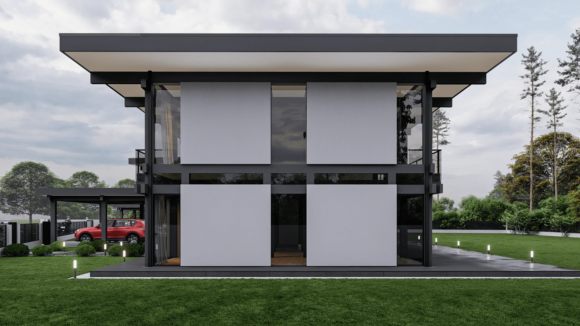 RIGA300 — это современная интерпретация классического фахверка с плоской кровлей и чистой архитектурной геометрией.