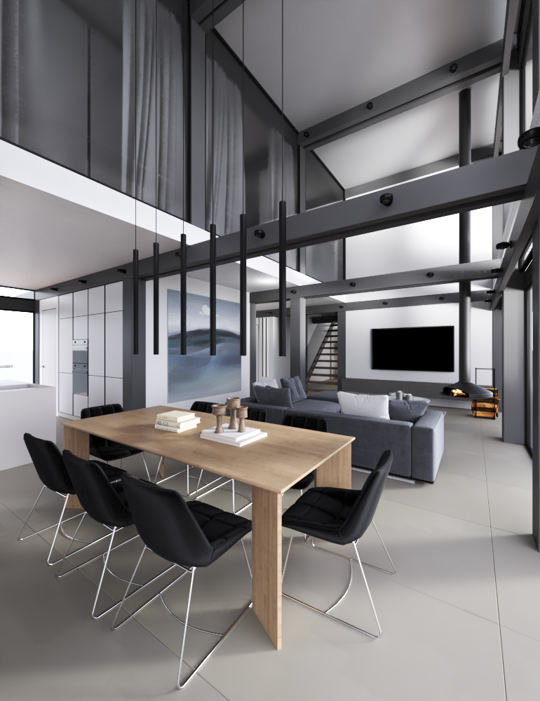 Высокие пролёты, большие открытые пространства, второй свет, панорамные фасады — всё работает на ощущение свободы и объёма. В таком доме пространство не делится на комнаты — оно течёт.