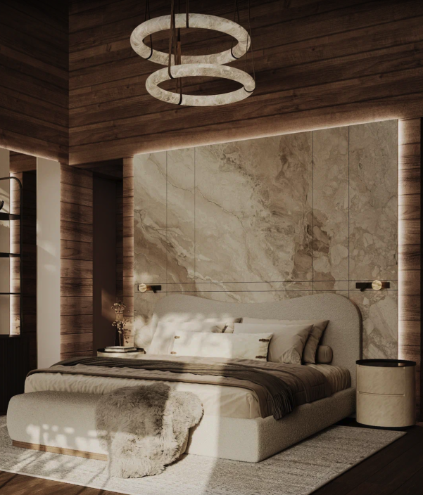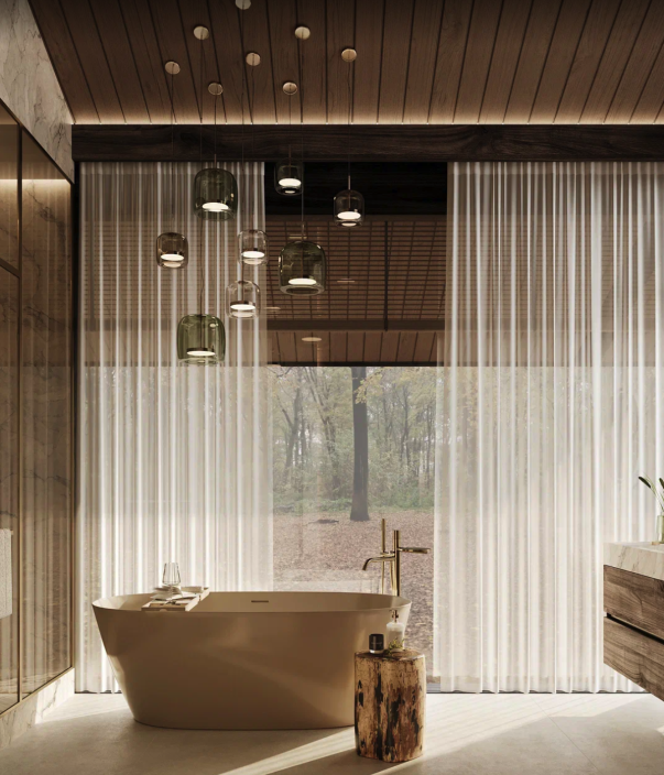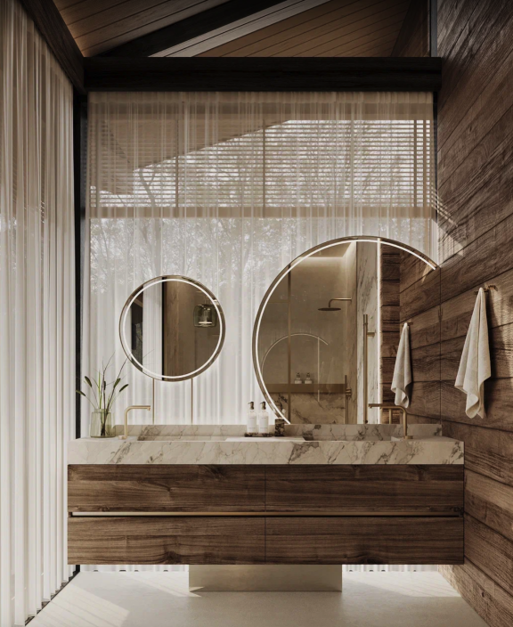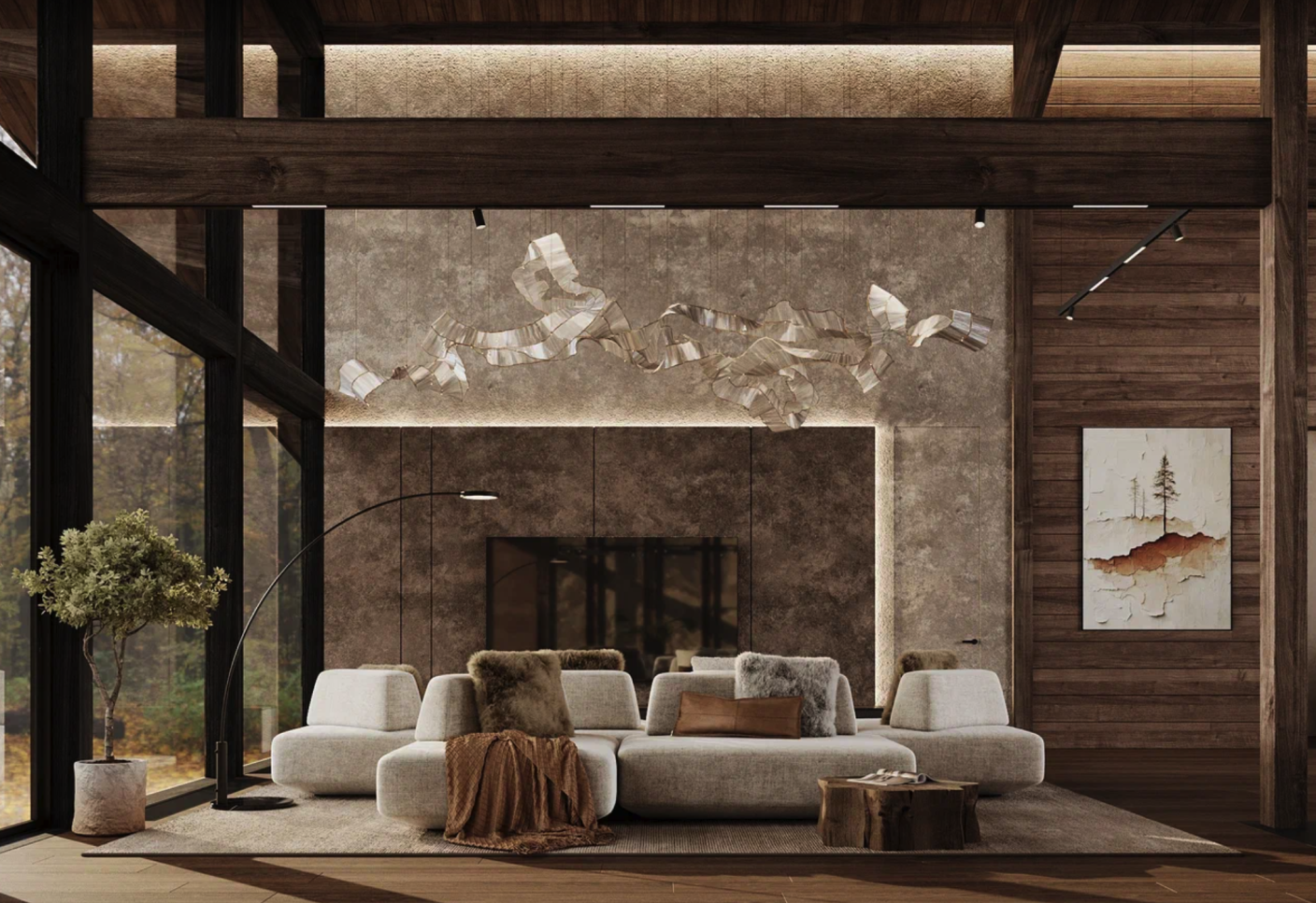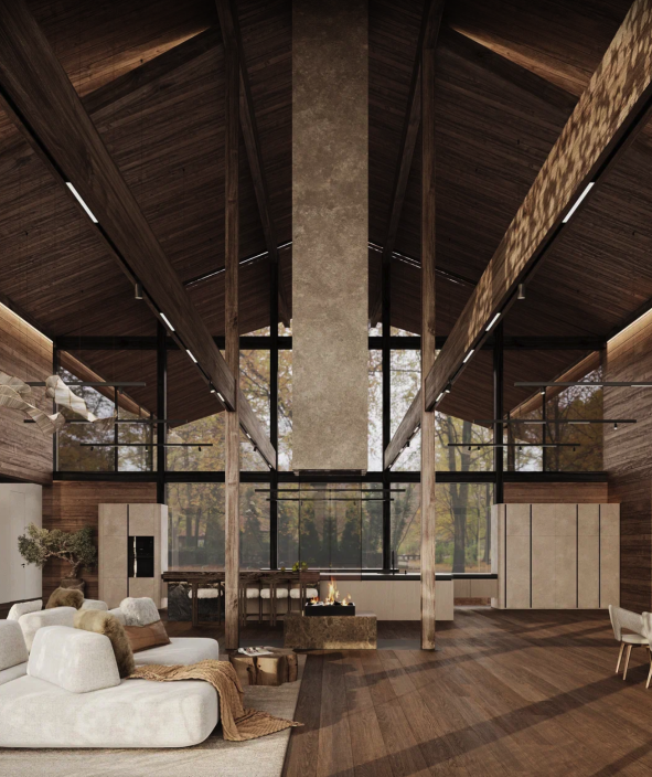 Этот элегантный проект впечатляет своим масштабом и выразительной архитектурой. Главной особенностью дома является просторная зона второго света с высотой потолка более 8 метров, благодаря чему интерьер наполняется воздухом, светом и ощущением настоящего объёма.