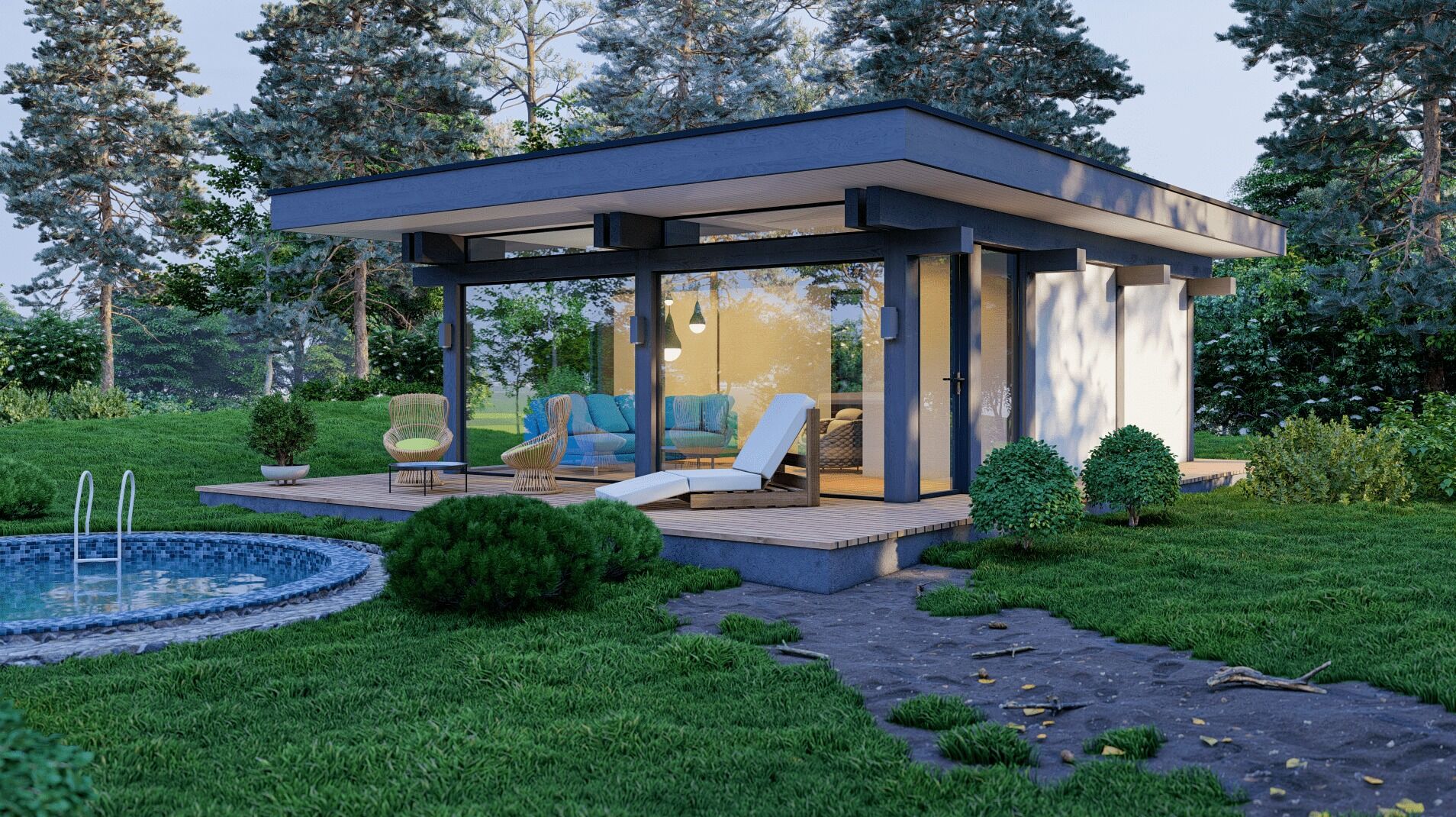 Стекло отражает небо и окружающий ландшафт, а дерево добавляет тепла и тактильности. Этот баланс формирует ощущение уюта без тяжеловесности.