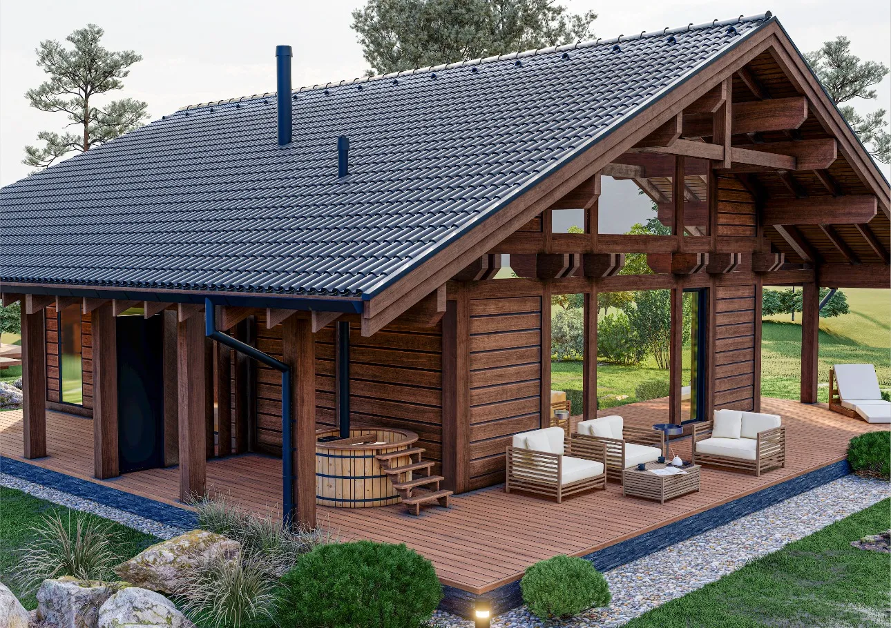 В основе проекта — мощная конструкция из клеёного бруса.