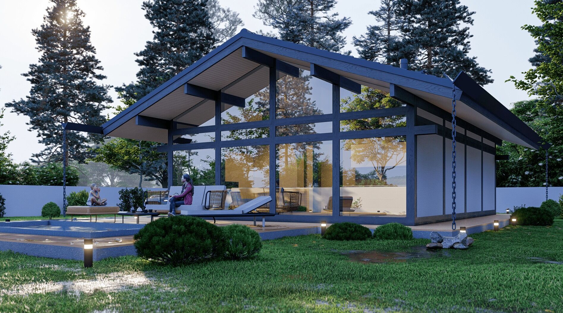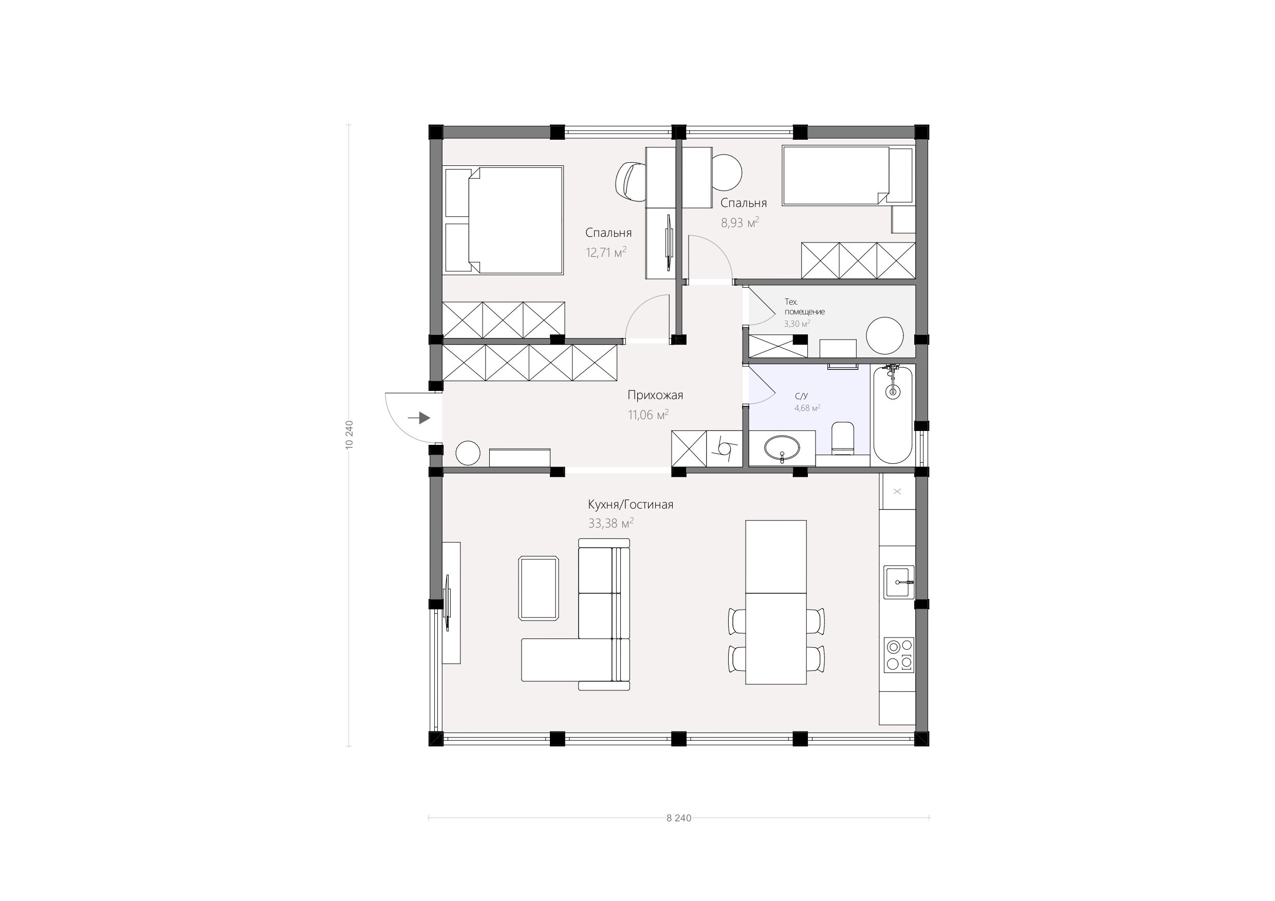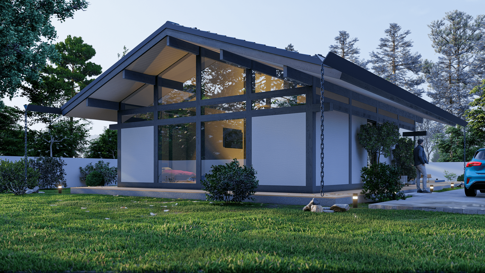 Этот одноэтажный дом с двумя спальнями и просторной кухней-гостинной представляет собой уютное и функциональное жилье для небольшой семьи. Открытая планировка создает пространство для семейных собраний и вечерних посиделок, обеспечивая комфорт и удобство повседневной жизни.